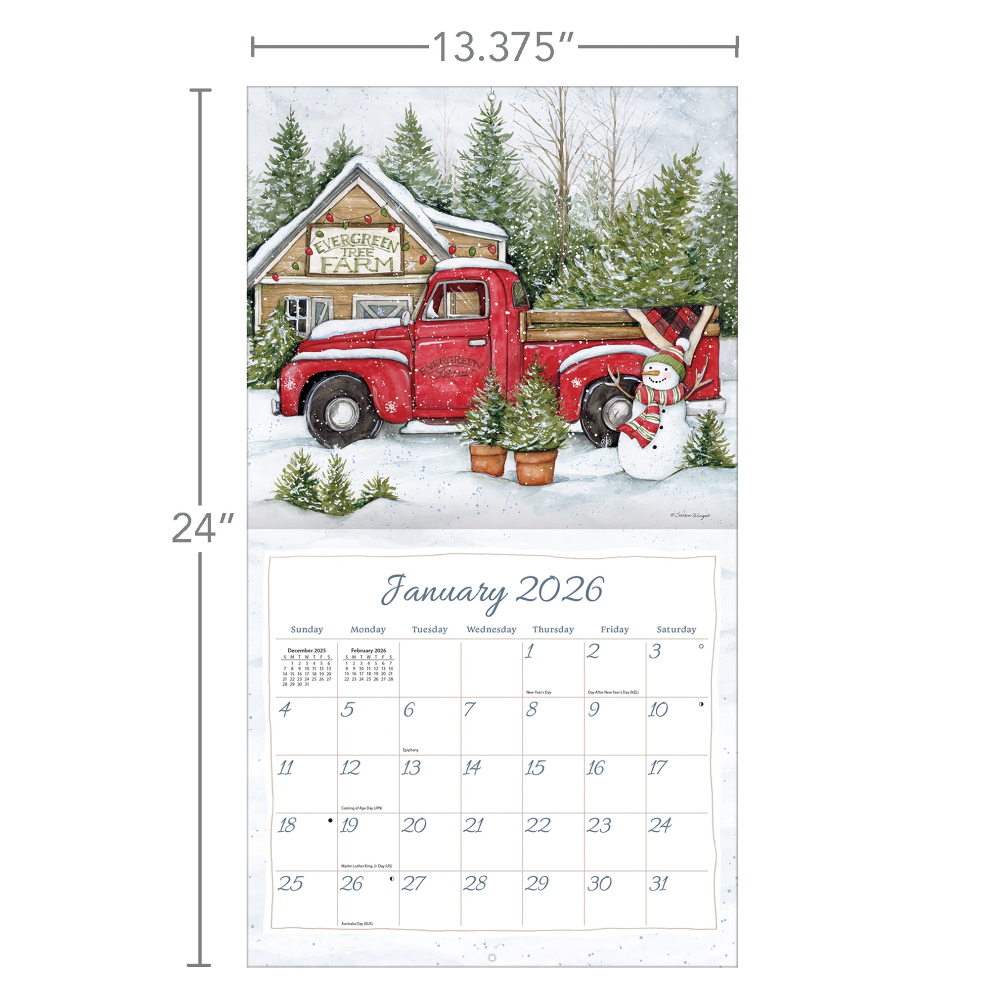 The Truckin' Along 2026 Wall Calendar features 12 months of Susan Winget's Red Truck paintings featuring familiar home and country scenes. LANG Wall Calendars feature monthly full color images, elegant linen embossed paper stock, and a brass grommet for hanging.