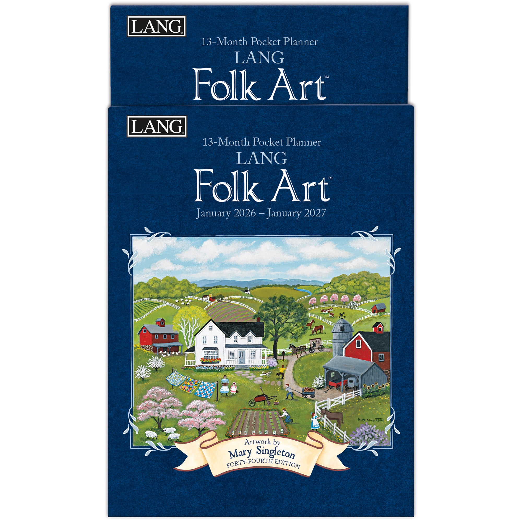 The LANG Folk Art 2026 Monthly Pocket Planner features artwork of idyllic American scenes by Mary Singleton in a 13-month calendar format with ample room for notes and engagements. LANG Monthly Pocket Planners also feature a 2026 Planning Guide and linen embossed paper cover and pocket sleeve.